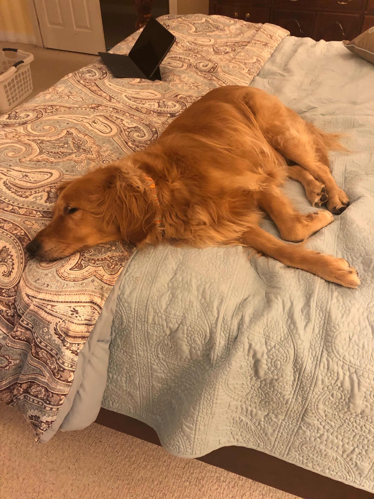 But I am not a pitching machine. Sometimes my throws are off target and she either can’t catch it, or her valiant attempt places her body in a contorted position from which a successful catch is nearly impossible. Such was the case yesterday morning when my second throw of the day was too high. She overran it a bit so when she launched herself to catch it she found herself too far under it and to its right. Instead of just letting it go she attempted an acrobatic catch by contorting her body wildly mid-flight in one of the most athletic displays I have ever been privileged to witness. Somehow she was able to snag the thing, a truly miraculous catch. But when she landed back on terra firma her legs were wildly out of position. She landed awkwardly, while somehow being able to maintain her balance. But when she began running back towards me she abruptly stopped and held up her front right paw, like she wanted to shake. Then she tried running again, only to stop again, holding out her paw again. Poor girl.