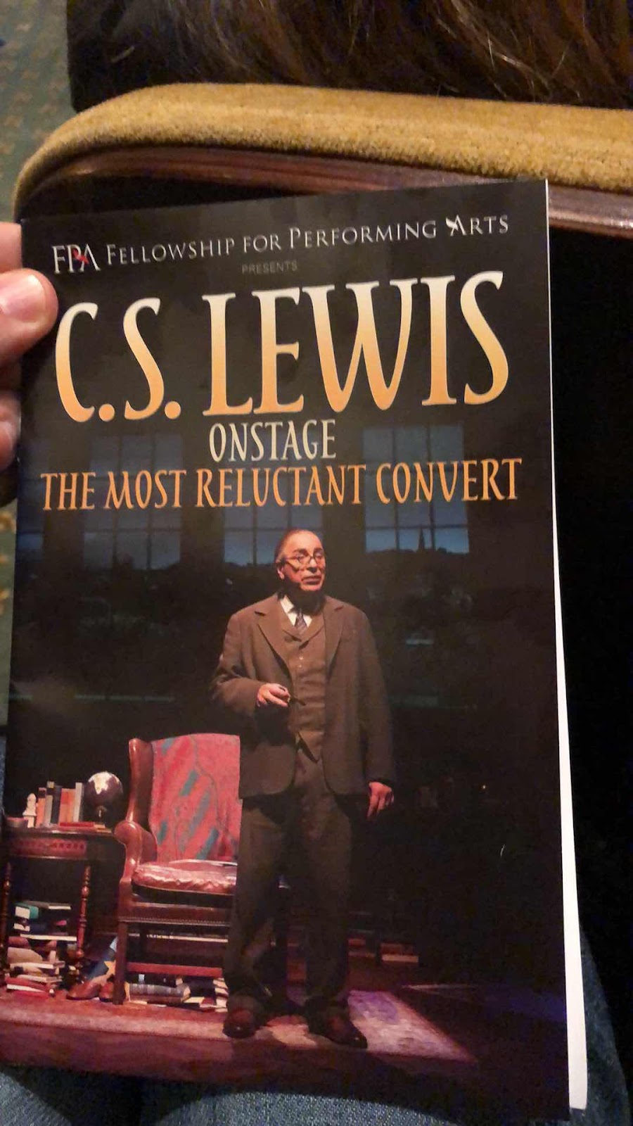 Then, after the show and a ten minute delay, the actor reappeared on stage, having removed his costume and makeup, to take questions from the audience about the show. It is always a risky thing to offer an audience to the general public because of the undeniable fact that most people are idiots. Sure enough, about four questions in, an older man stands up and offers the following gem. Ok, remember what this play was about, something that it might be easy enough to discover simply by the play’s name...The Reluctant Convert. It is the story of how an avowed atheist, and renowned scholar of classic literature went from being an atheist to becoming perhaps the greatest apologist since the Apostle Paul over a period of 20 years: