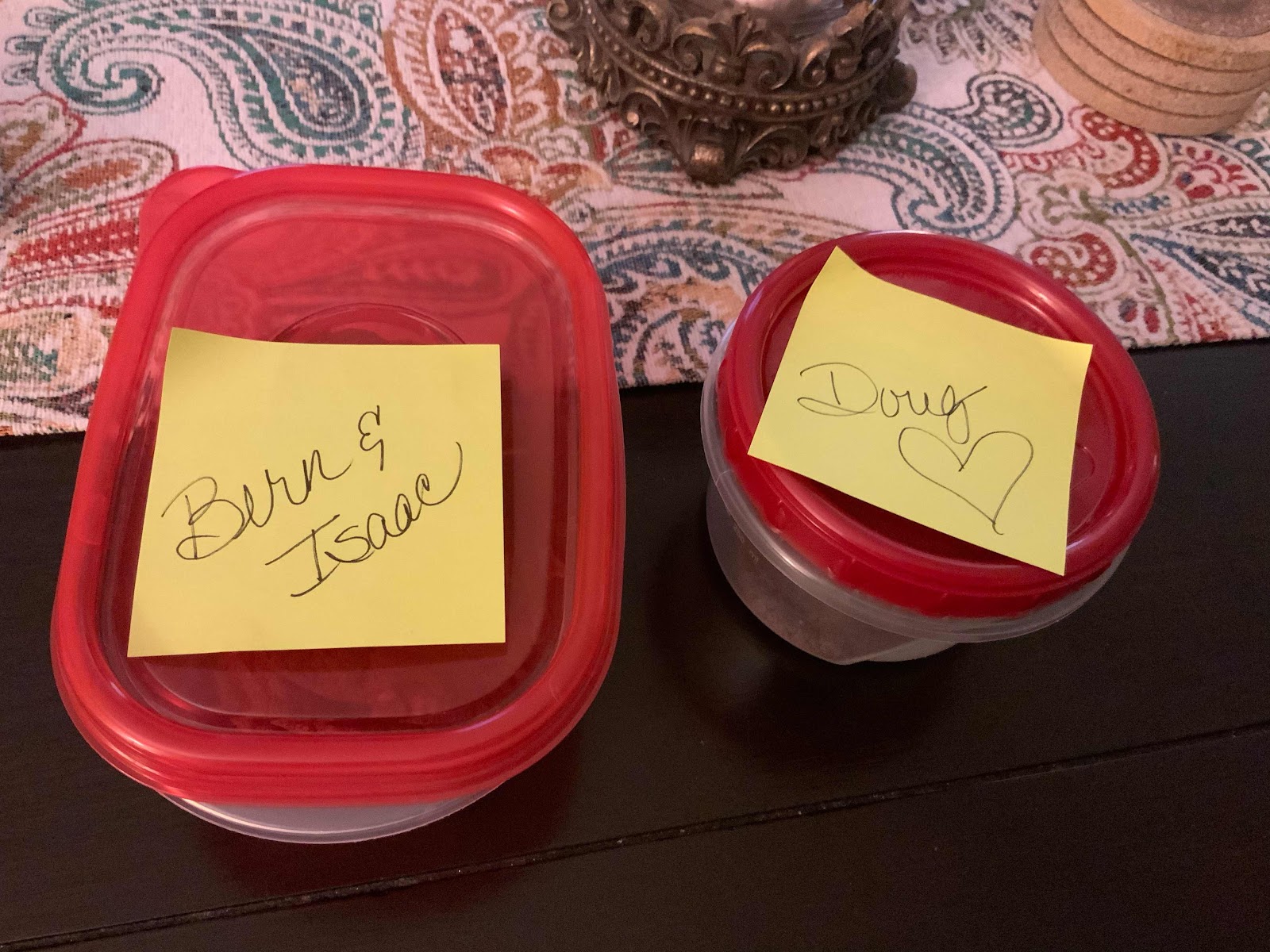 Of course, any trip that involves two or more Dunnevant women must have a functioning snack table. Long time readers of this space have been treated to photographic evidence of the many snack tables of past vacations. They are a monument to high blood pressure, cholesterol and diabetes, and represent the complete and total abandonment of all self restraint, and without them we would all perish. So, despite the fact that this particular trip is only for three days and two nights, a snack table still has to be erected. To that end, Pam spent much of yesterday preparing an assortment of trail mixes and cookies. Because she is Pam, she didn’t forget me, or Bernadette and Isaac...