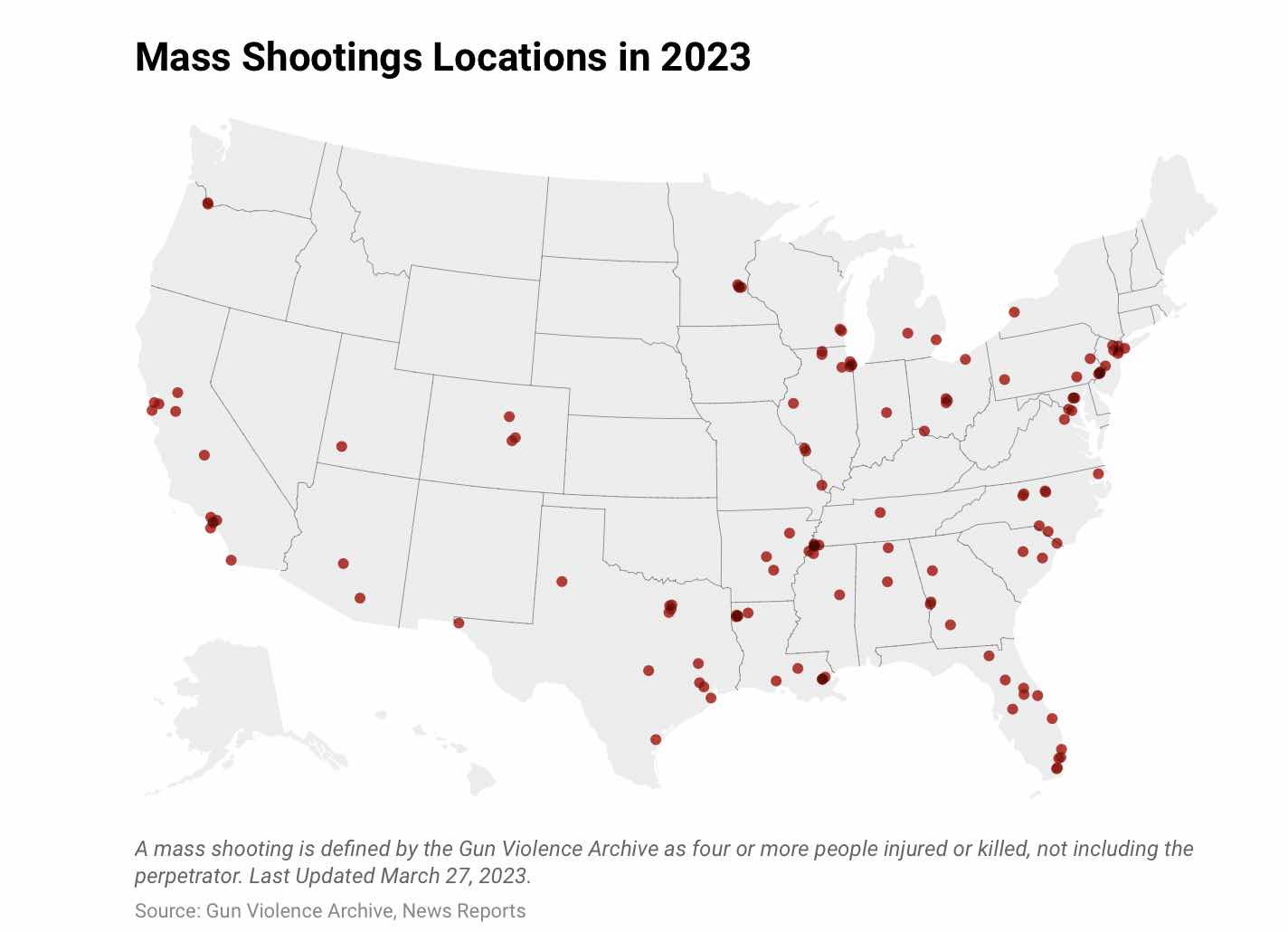 This chart includes only shootings where at least 6 are killed and covers the twenty years between 1999 and 2019.