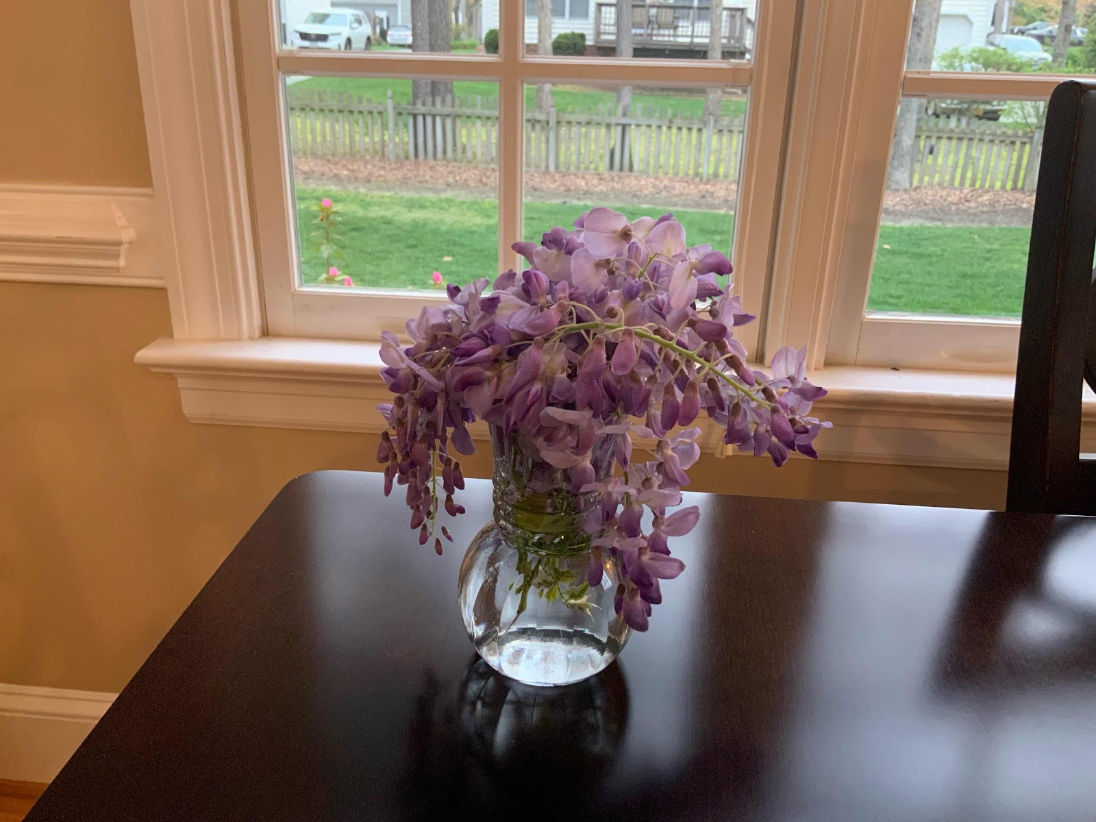 I am at hour 48 of an annoying headache. Haven’t had one like this in a very long time. So, what do I do? On the way back from the Cafe I pulled my car slightly off of Pump Road in a dangerous spot and stole these wisteria blossoms off a huge tree from some random person’s yard, brought them home, stuffed them in a vase and presented them to Pam because I love her and it took my mind off my pounding headache for ten minutes.