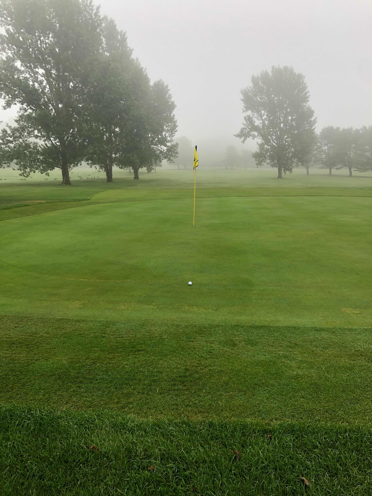 1. This morning I made the 35 minute drive into Rockland to play golf for the first time in nearly a year. Now that I am staring directly down the gun barrel of retirement I have been thinking that I should probably rekindle my interest in golf since soon I will have plenty of time to devote to it. So, on a perfectly dreary morning filled with drizzle and fog, I played nine holes at Rockland Golf Club. I shot a 45 which came as no surprise, after all it had been a year, the conditions were poor, I was using rental clubs and could hardly see further than 100 yards because of the fog. What was surprising was the number of really nice shots I hit, none better than this one. The ninth hole is a 220 yard par 3. I hit a 3-wood that felt great but I immediately lost it in the thick fog. When I reached the green, there it was 12 feet beyond the flag stick. The ball mark was six feet from the hole. Of course I missed the putt, but it was a great way to finish the outing.