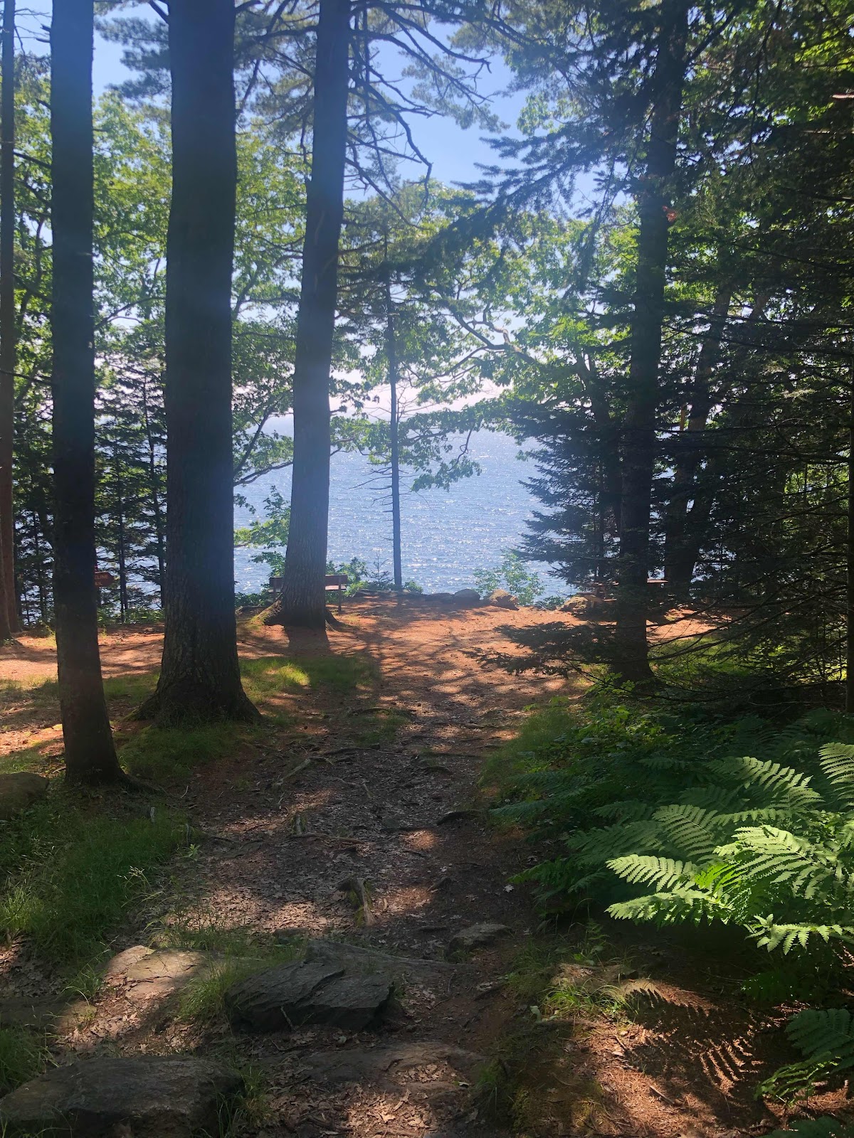From the parking lot you enter into thick woods of towering pines. There is a stairway made from rocks and pine needles that you follow. In the distance you can hear the ocean and each step you take, the briny air from it becomes more dominant. Eventually through a break in the trees you see Penobscot Bay…