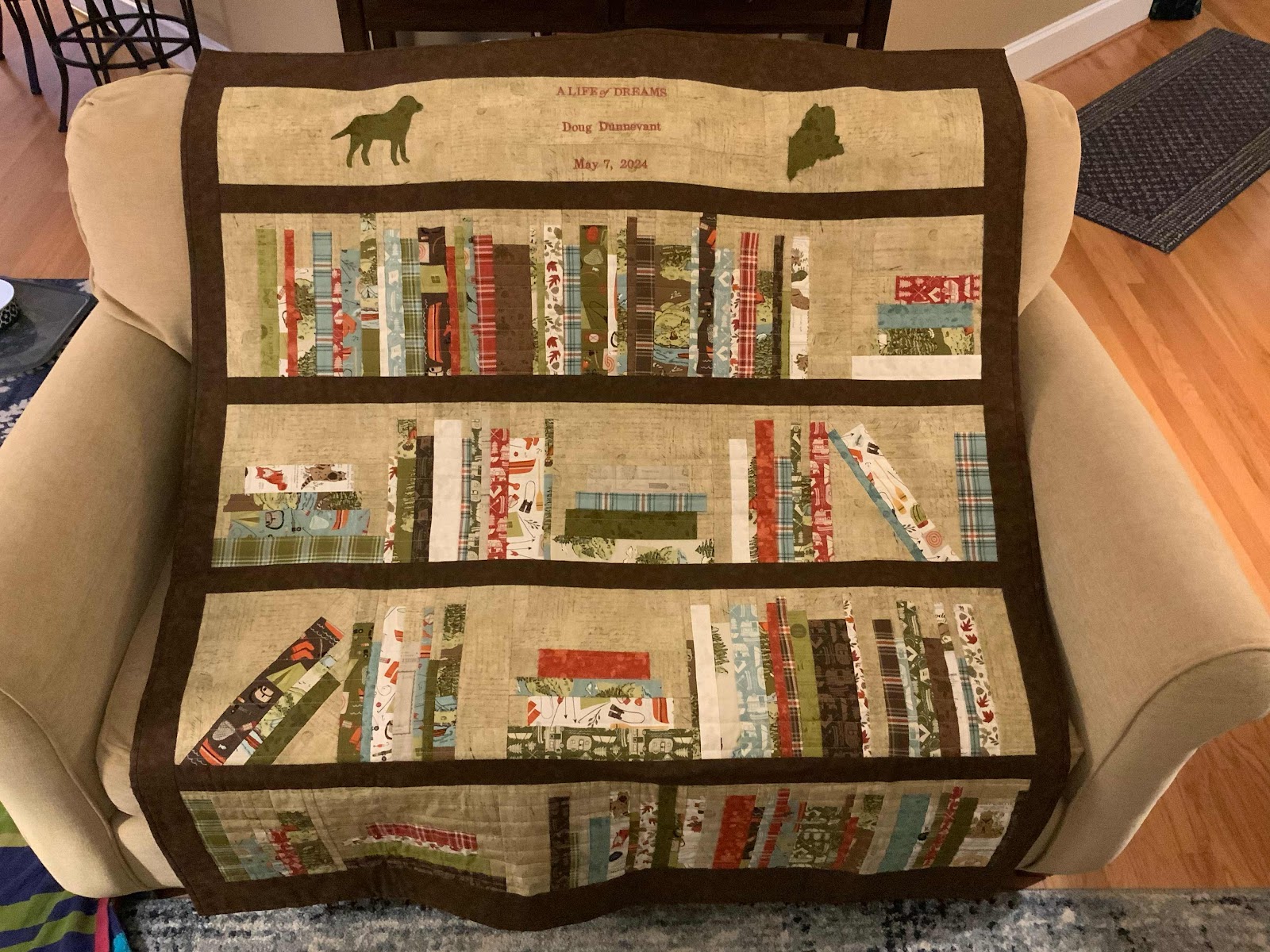 Then something amazing happened. A wonderful lady at my office presented me with a gift that astonished me to the point where I couldn’t form words to properly thank her. She had spent no telling how long making me a quilt filled with all the things I love—scenes from Maine, writing, and my dog Lucy.