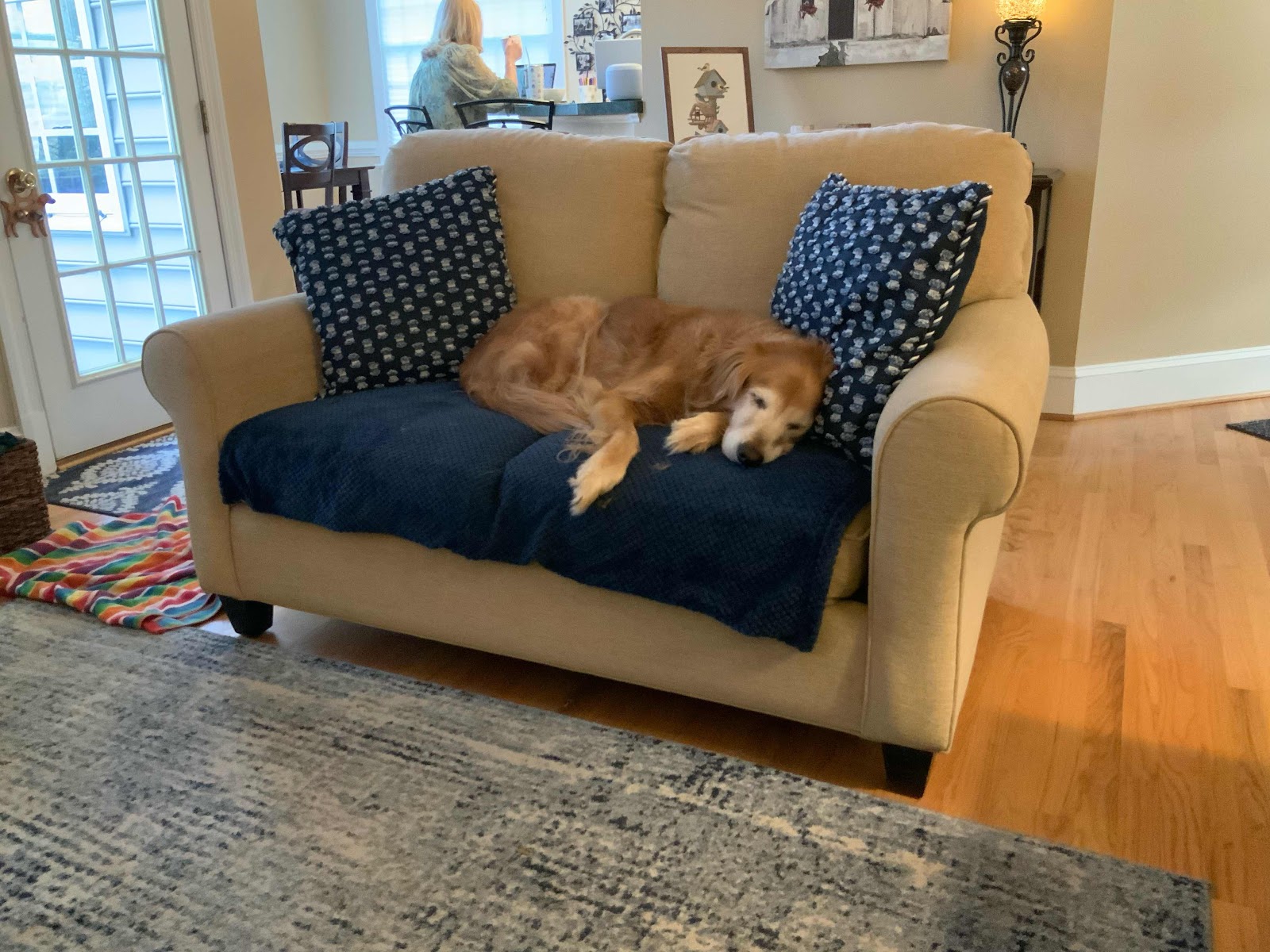In other words, Lucy follows me everywhere I go. She does not insist on me engaging with her, she seems content just to be there with me in anything I happen to be doing. When I am at my desk in the library she will turn around three revolutions then collapse herself on the floor at my feet with a mighty groan—her hips aren’t as nimble as they used to be. By the end of her day she is more tired than she used to be. Lucky for her she has many favorite snoozle locations throughout the house…